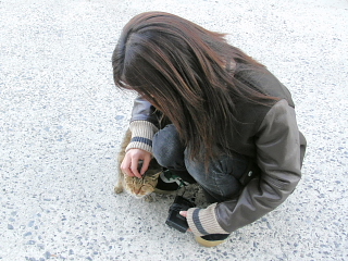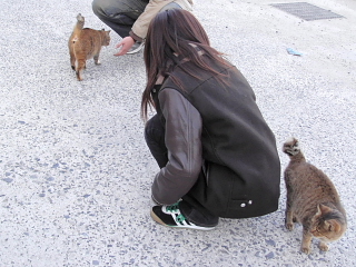 猫に歓迎されるスタッフ