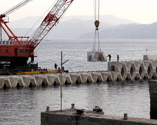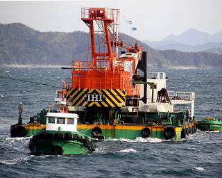 防波提のブロックを積んだ起重機台船が今日もやって来ました。